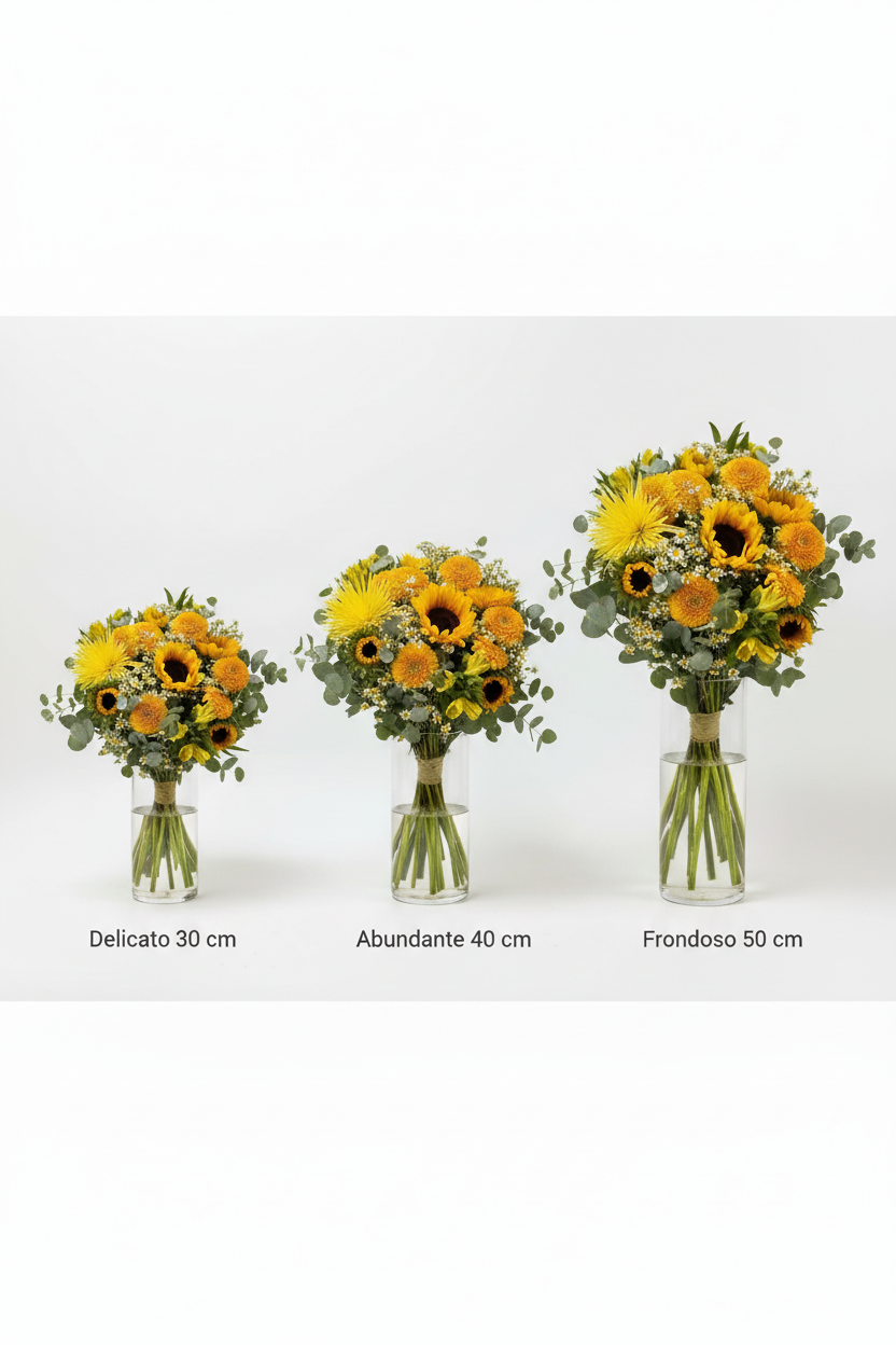 El Ramo Sol Dorado de Florela irradia alegría, frescura y color. Elaborado con girasoles naturales, crisantemos amarillos, margaritas y eucalipto, este diseño floral es una explosión de energía y optimismo que ilumina cualquier rincón.