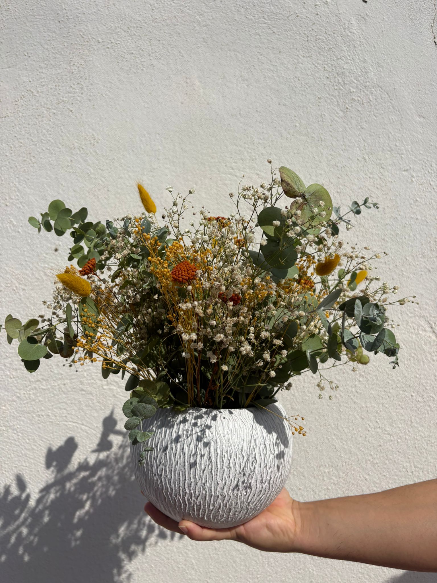 Incluye un jarrón blanco con textura orgánica, ideal para aportar un toque natural y moderno al espacio.