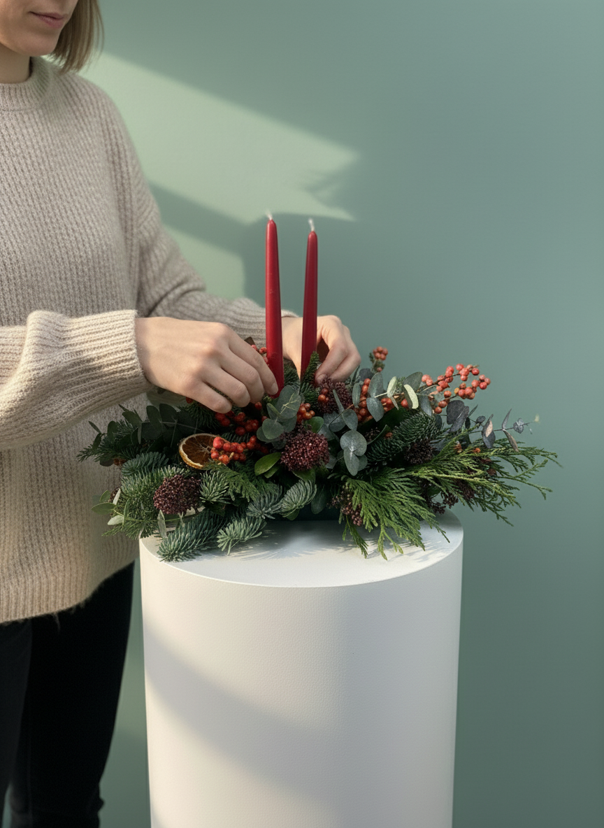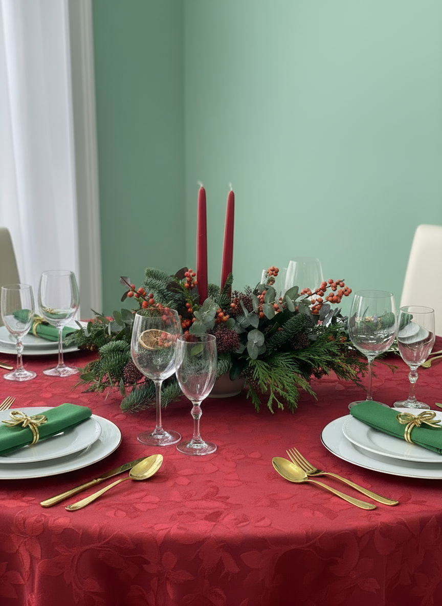 Este centro está pensado para llenar tu hogar de esa magia que solo se siente en Navidad. Con verdes naturales, toques de rojo intenso y dos velas que iluminan con suavidad, es perfecto para crear un ambiente cálido, elegante y lleno de vida en tus cenas o momentos especiales.