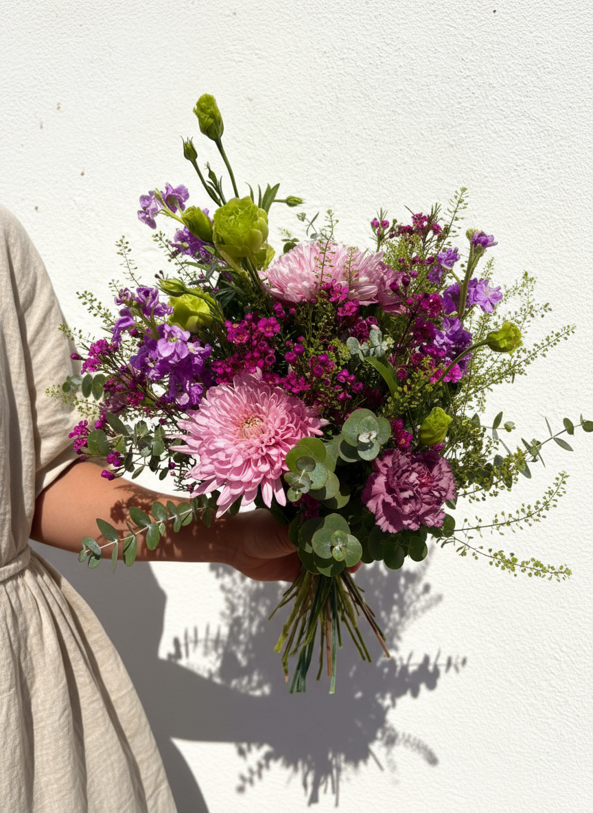 El ramo de flores frescas en tonos malva y verde destaca por su estilo natural, romántico y sofisticado. Una composición equilibrada con crisantemos, claveles verdes, flor de cera, limonium y eucalipto, perfecta para quienes buscan un ramo silvestre con un toque moderno.