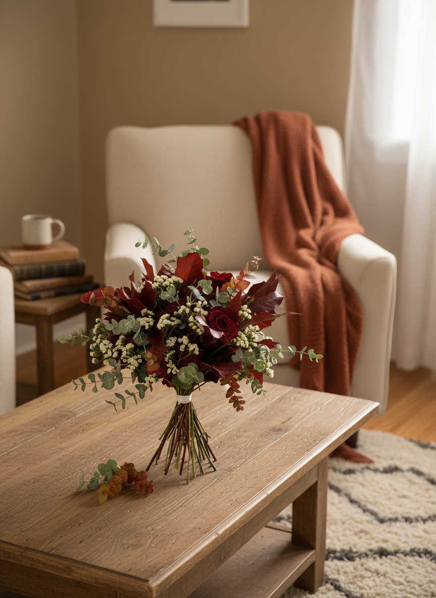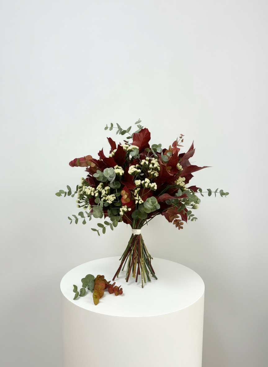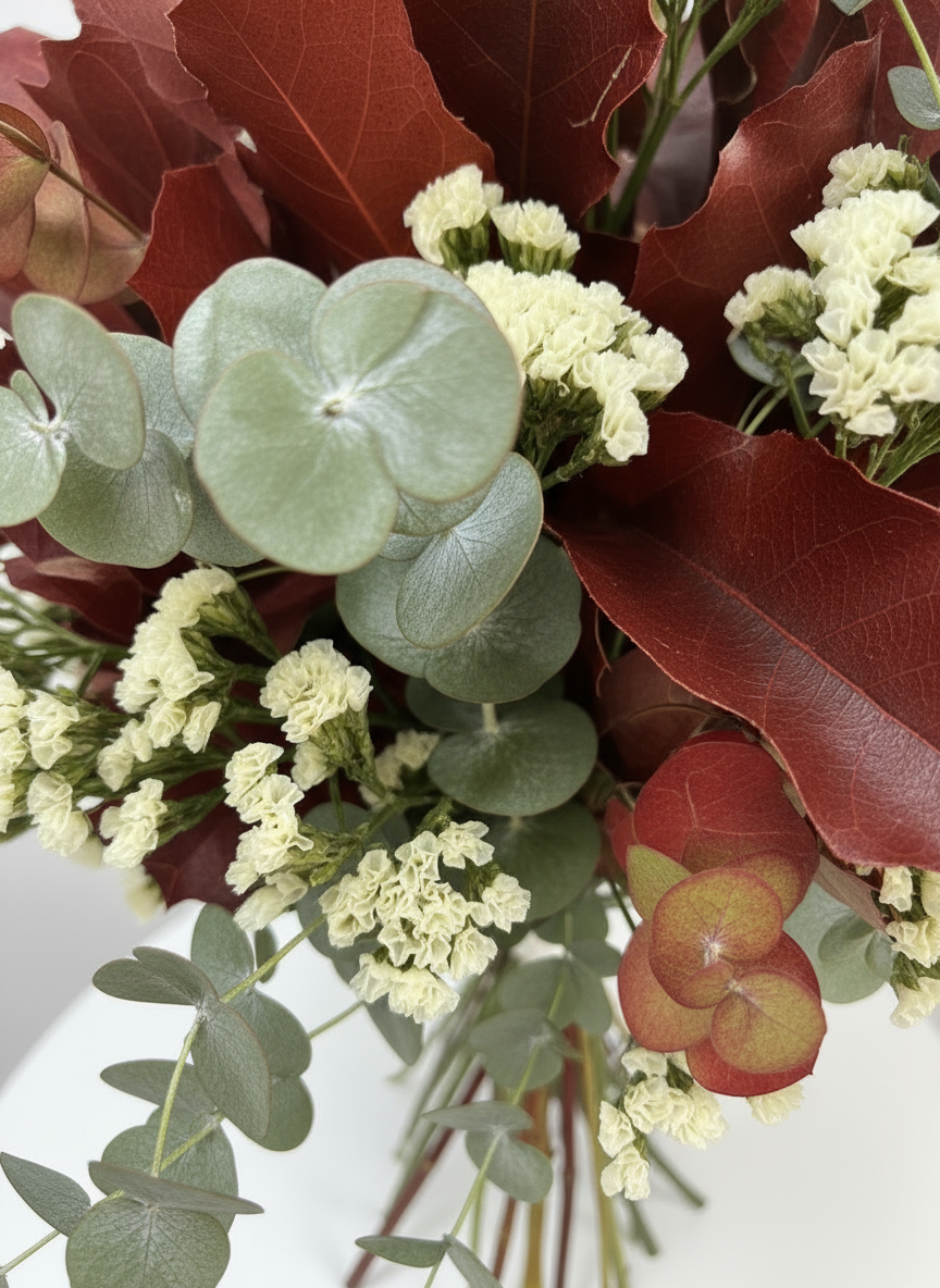 El Ramo Cálido de Florela captura la esencia de la estación con una armoniosa combinación de hojas de roble burdeos, eucalipto y flor seca en tono marfil.