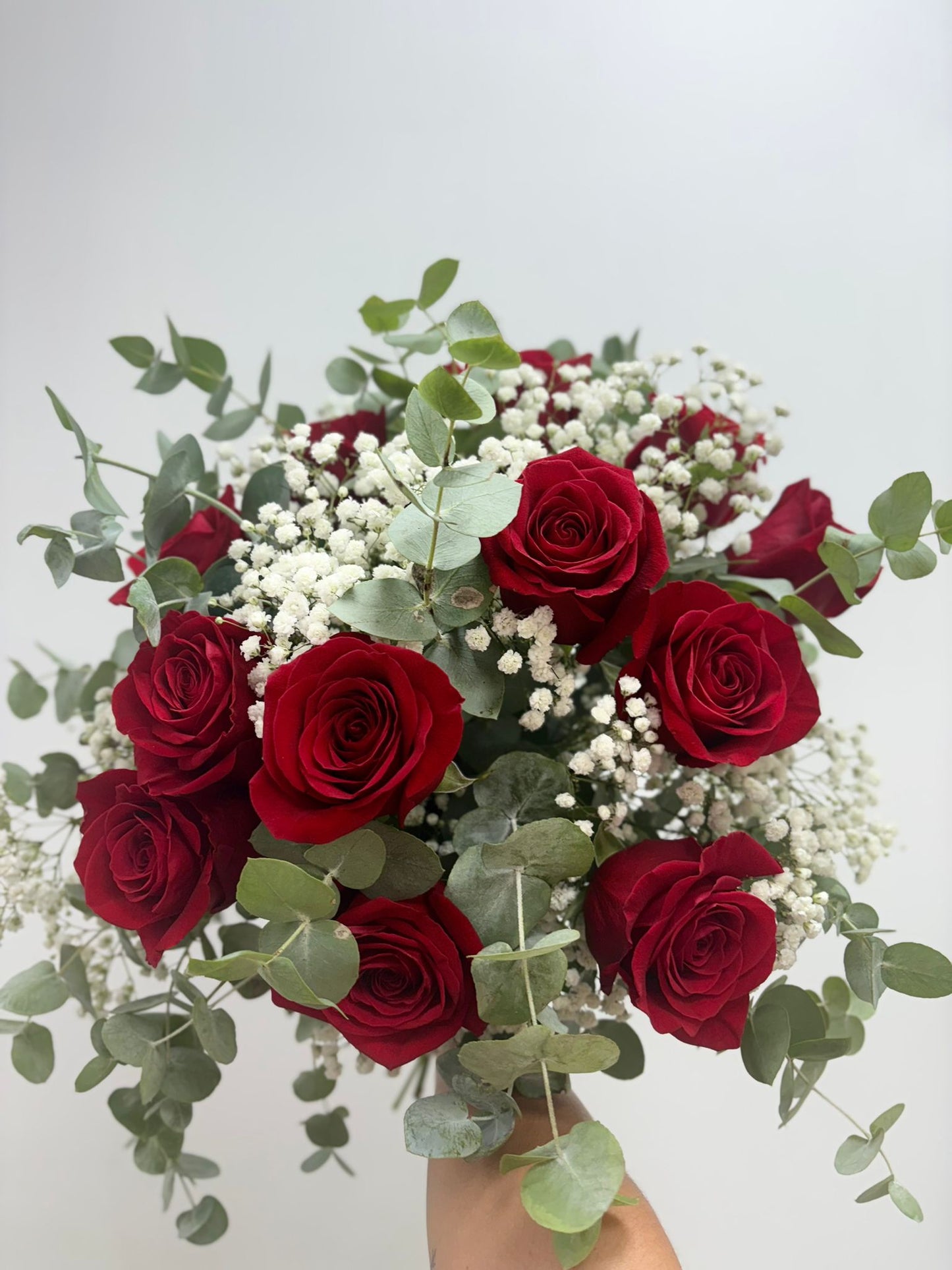 El ramo de rosas rojas con eucalipto es la expresión más pura del amor eterno y la elegancia natural. Cada rosa roja simboliza la pasión y el cariño más profundo, mientras que las hojas de eucalipto aportan frescura, textura y un aroma inconfundible.