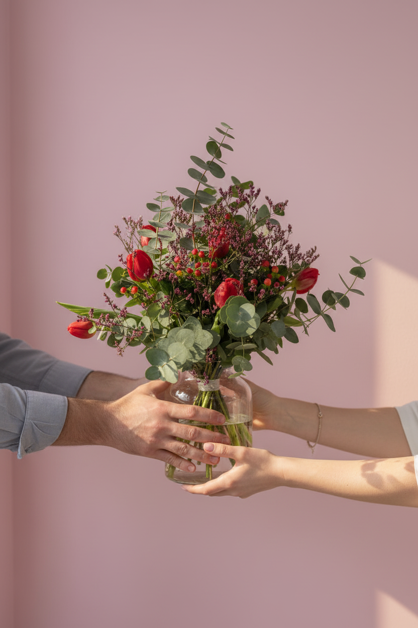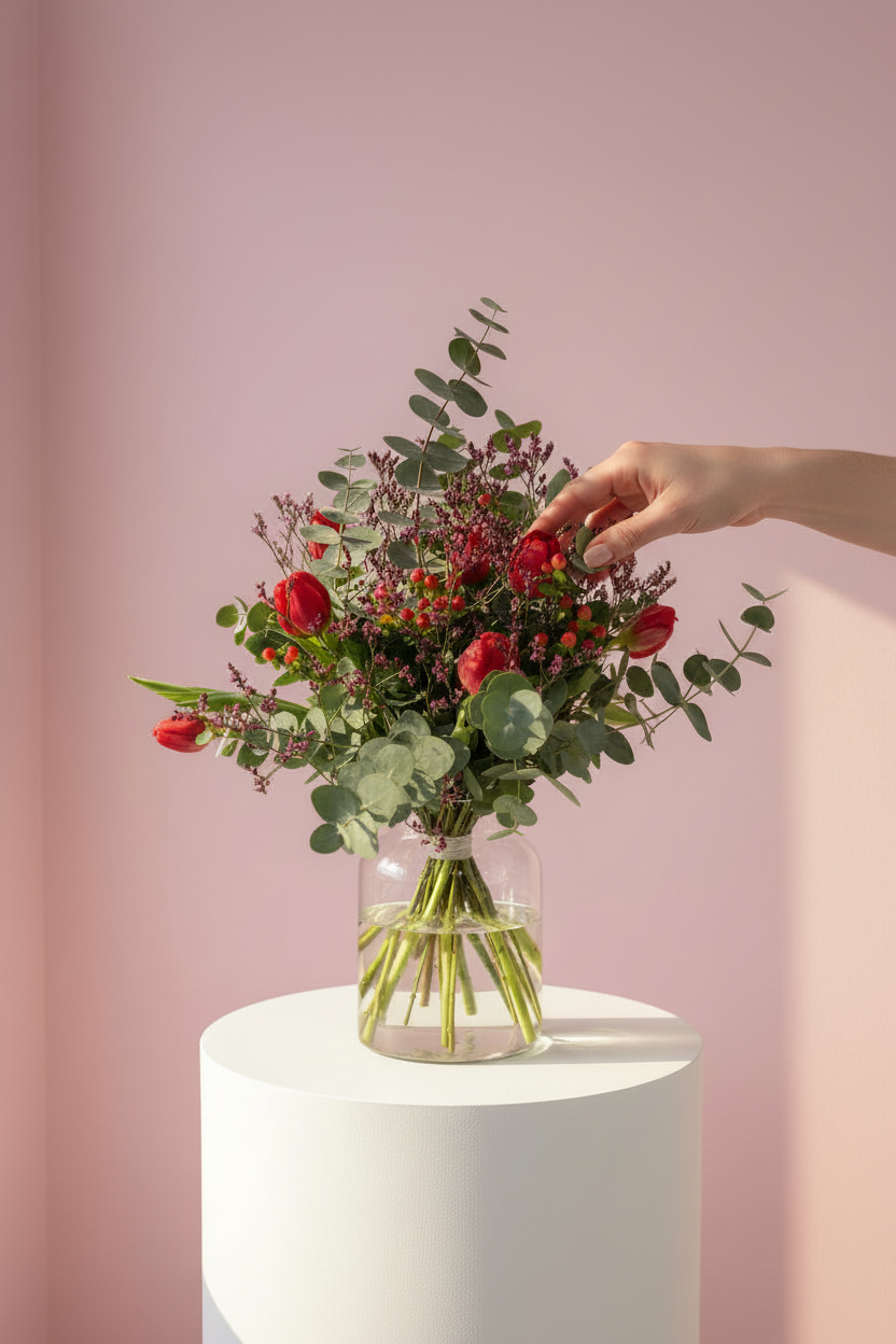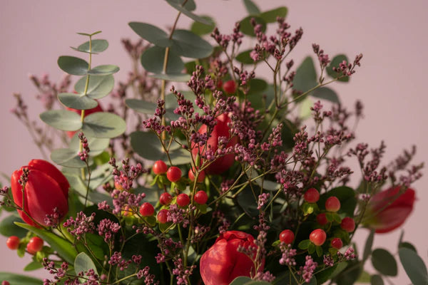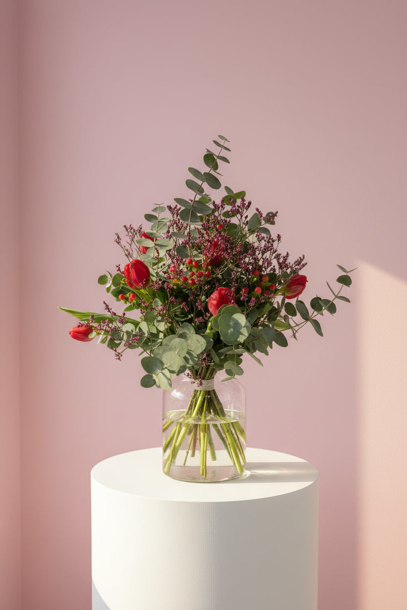 Una mezcla equilibrada de tulipanes rojos, eucalipto fresco y pequeños detalles florales que aportan textura y movimiento, creando una composición natural, elegante y llena de vida.