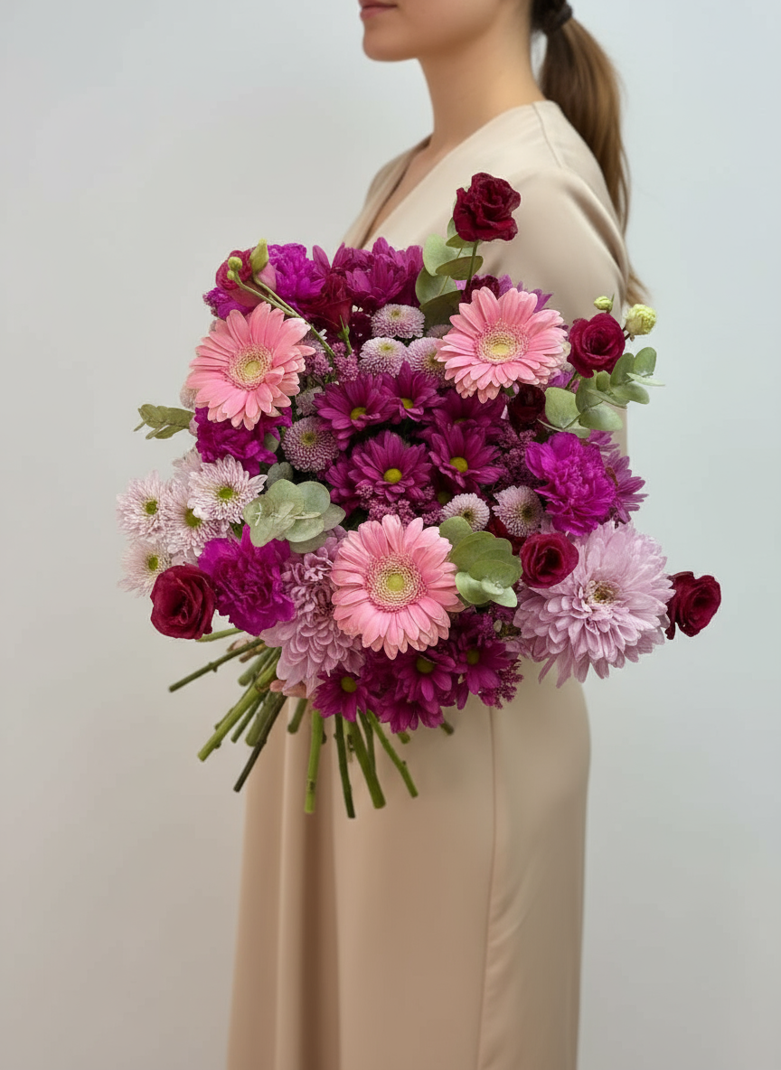El Ramo Magia Fucsia de Florela destaca por su fuerza, color y elegancia. Diseñado con una combinación de gerberas rosadas, crisantemos fucsia y malva, claveles y rosas burdeos, y un toque de eucalipto, este ramo es pura vitalidad floral.