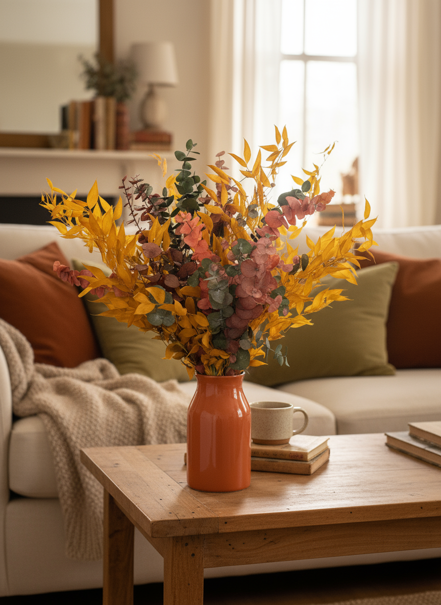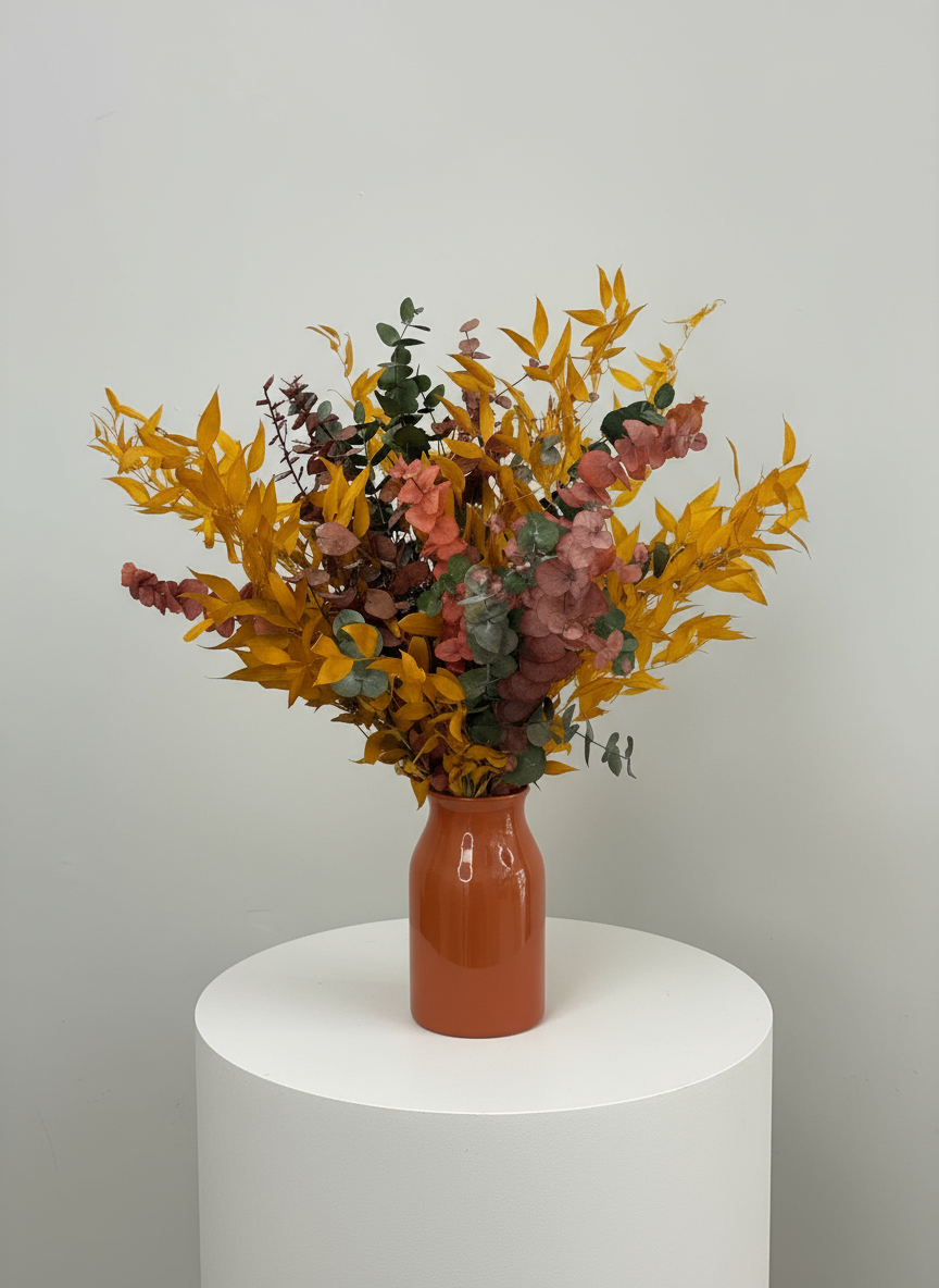 Nuestro ramo combina tonos cálidos en amarillos, rojizos y verdes que evocan la esencia del otoño y llenan de armonía cualquier rincón. Colocado en un jarrón, se convierte en la pieza decorativa perfecta para el hogar o como regalo especial, ya que no necesita agua ni mantenimiento.