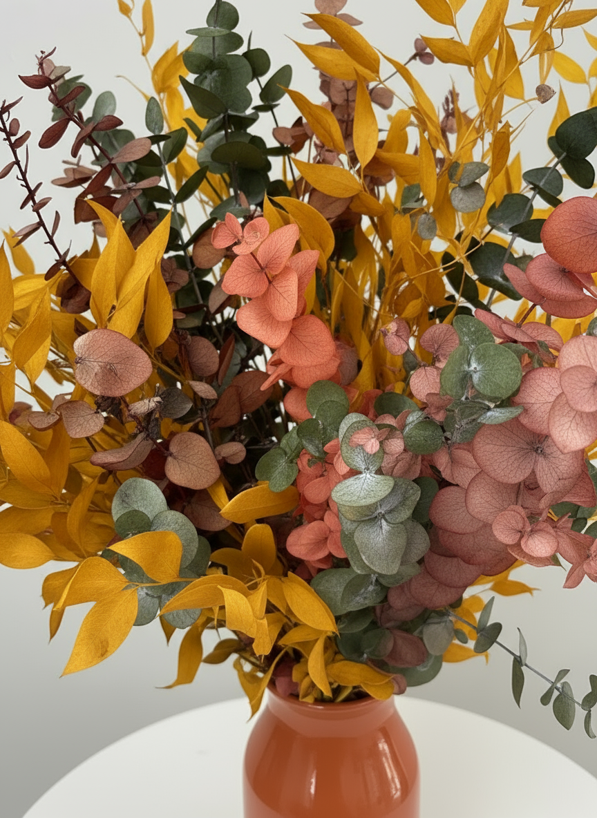 El ramo preservado acogedor es una pieza artesanal que captura la esencia del otoño en cada detalle. Su combinación de eucalipto preservado en tonos verdes y burdeos, junto con hojas doradas de tonos cálidos, crea una composición equilibrada, elegante y duradera.