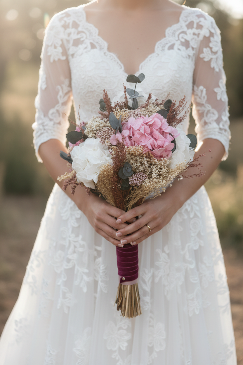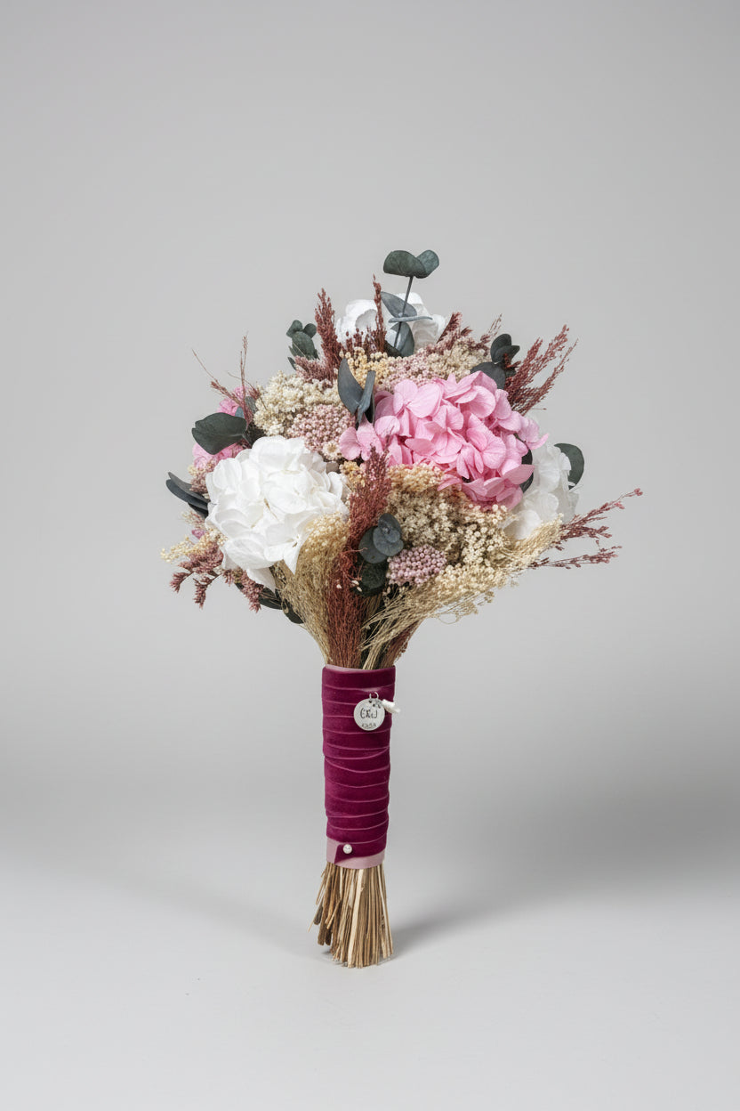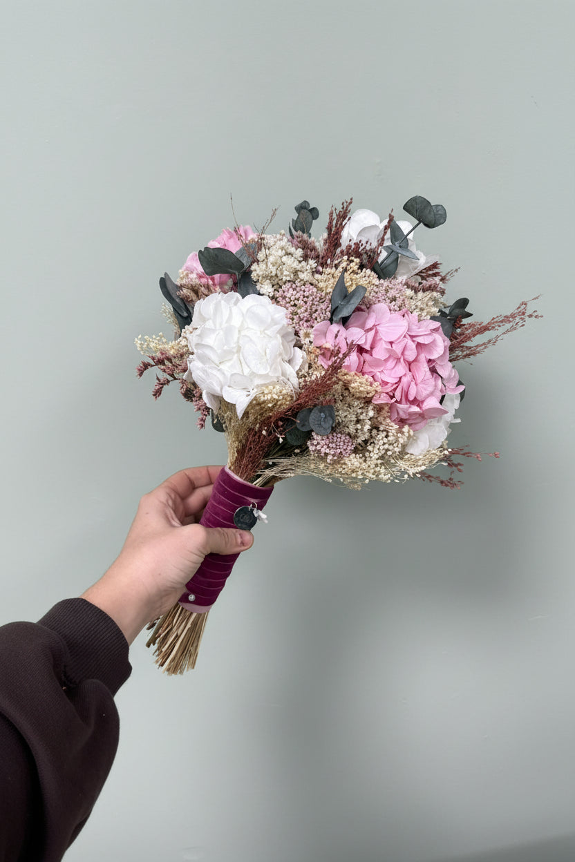 La suavidad de las hortensias en tonos rosa empolvado y blanco se combina con flores preservadas y eucalipto, creando una composición equilibrada, elegante y ligera. Cada detalle está pensado para transmitir calma, amor y armonía, sin excesos, dejando que la emoción sea la verdadera protagonista.